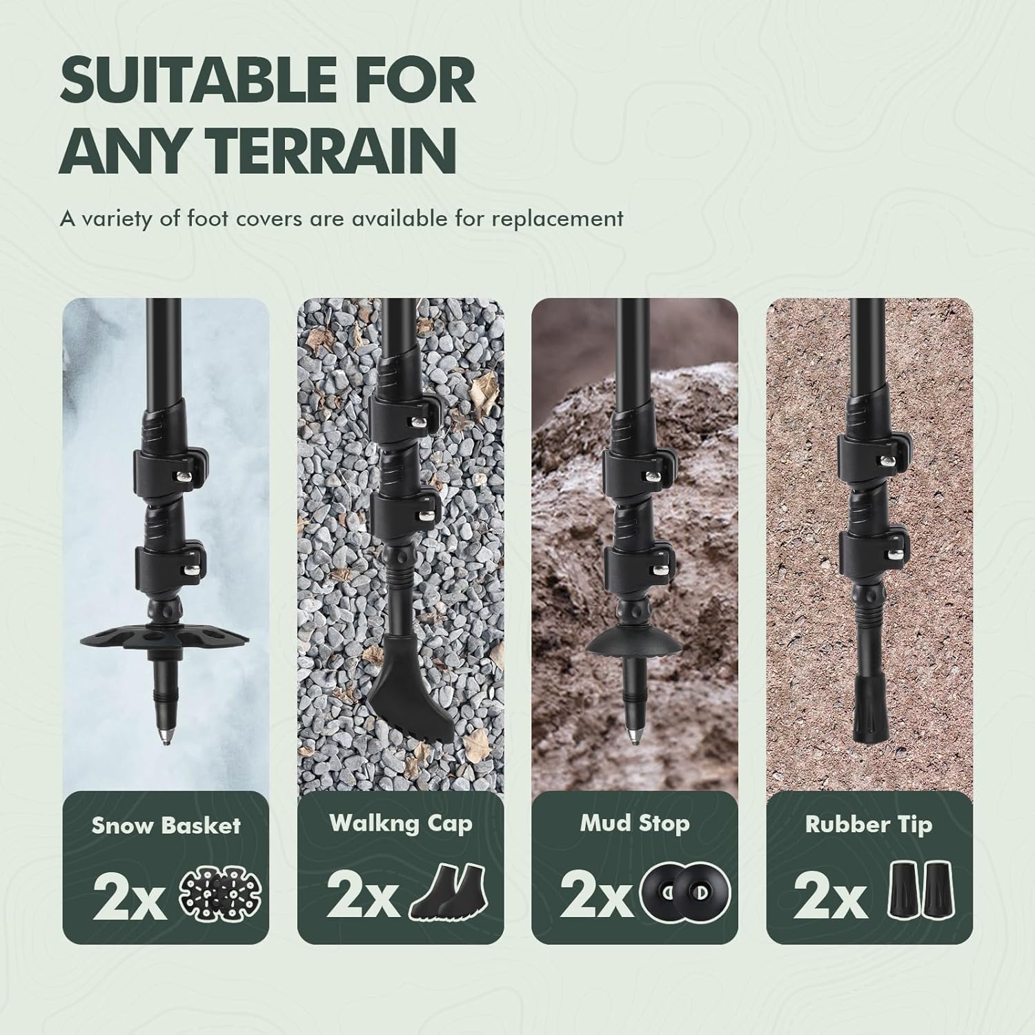 The KINGGEAR Walking Stick is the ultimate companion for all your hiking and trekking adventures. Made from lightweight 7075 aluminum, these adjustable hiking poles are durable and built to last. The flip lock mechanism allows for easy and quick adjustment to suit your height and terrain.
